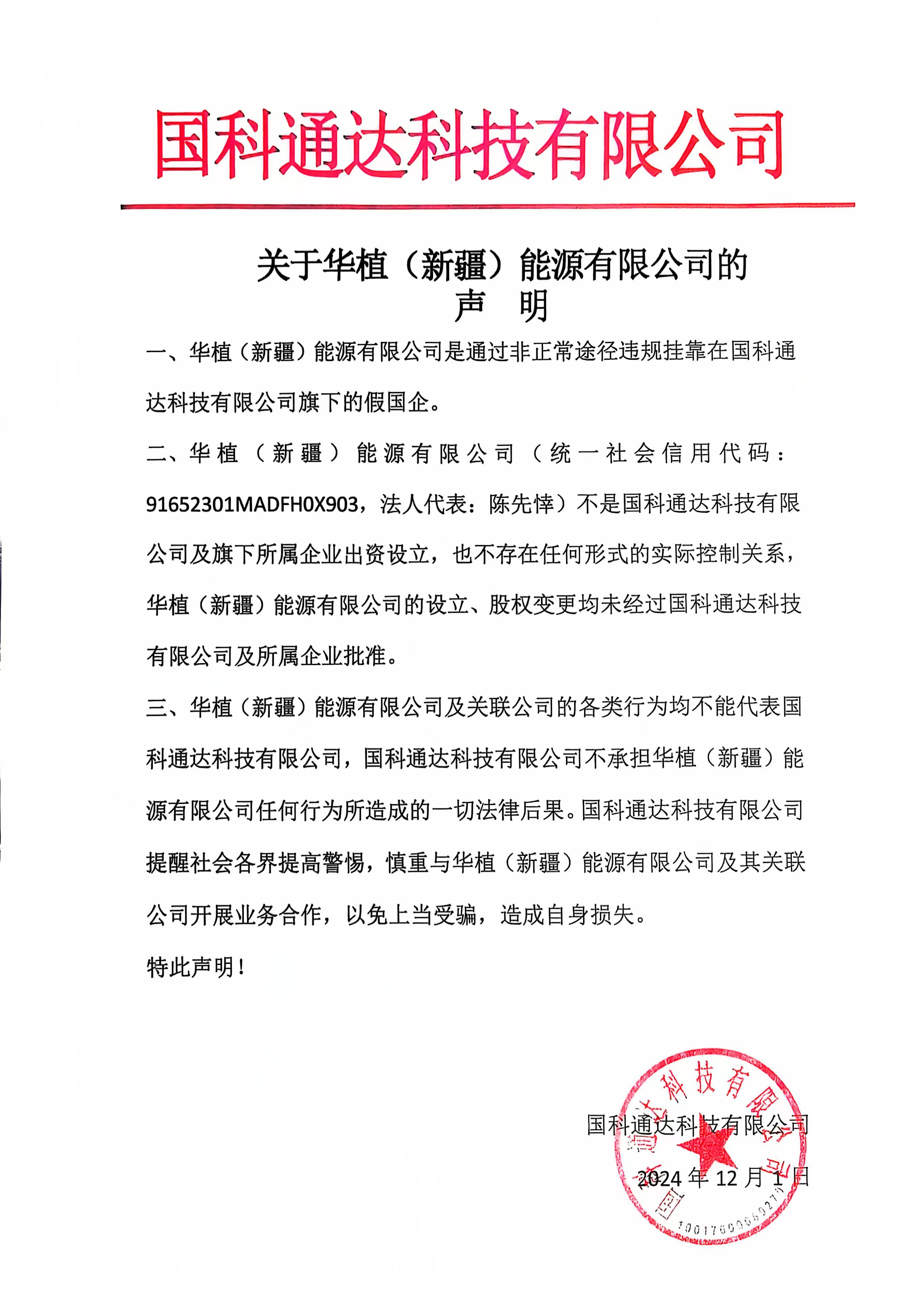 二、華植(新疆)能源有限公司(統(tǒng)一社會(huì)信用代碼:91652301MADFH0X903,法人代表:陳先悻)不是國科通達(dá)科技有限公司及旗下所屬企業(yè)出資設(shè)立,也不存在任何形式的實(shí)際控制關(guān)系,華植(新疆)能源有限公司的設(shè)立、股權(quán)變更均未經(jīng)過國科通達(dá)科技有限公司及所屬企業(yè)批準(zhǔn)。
